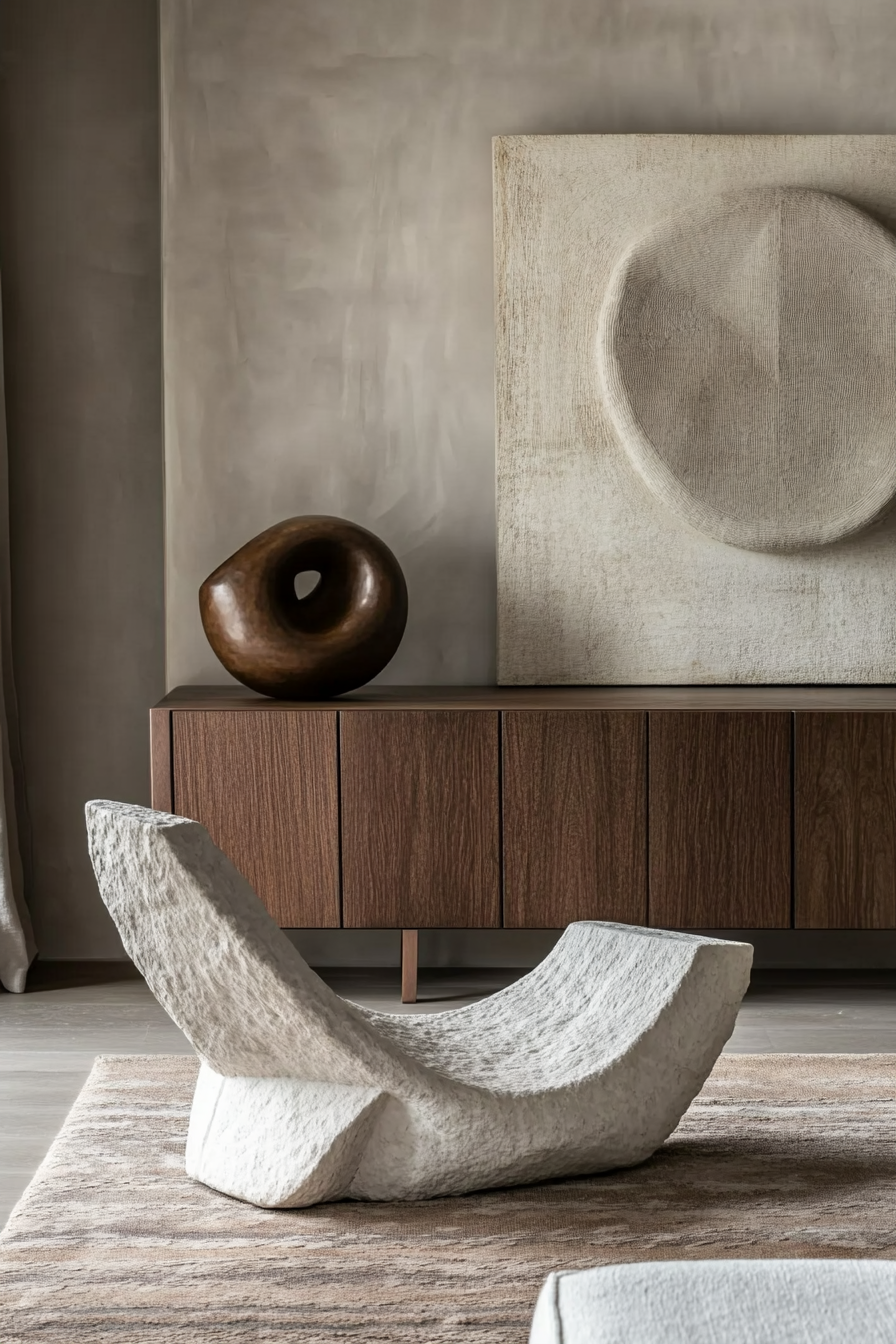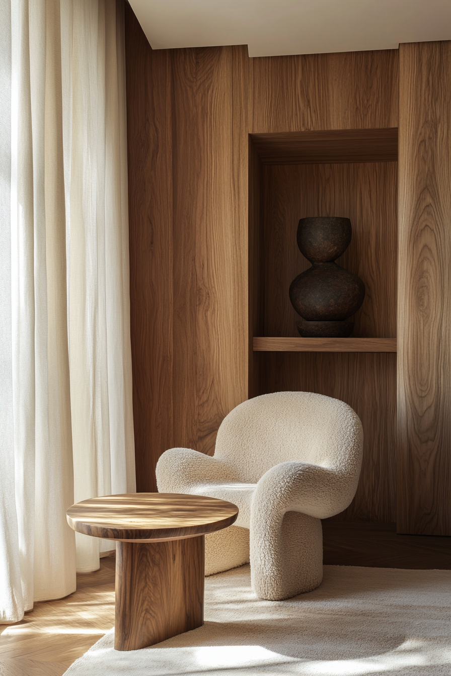 حدّد قطعة “statement”: أريكة منحنية، كرسي مميز، طاولة خشب طبيعية — تجعل الغرفة تبدو أكثر نعومة وانسيابية .